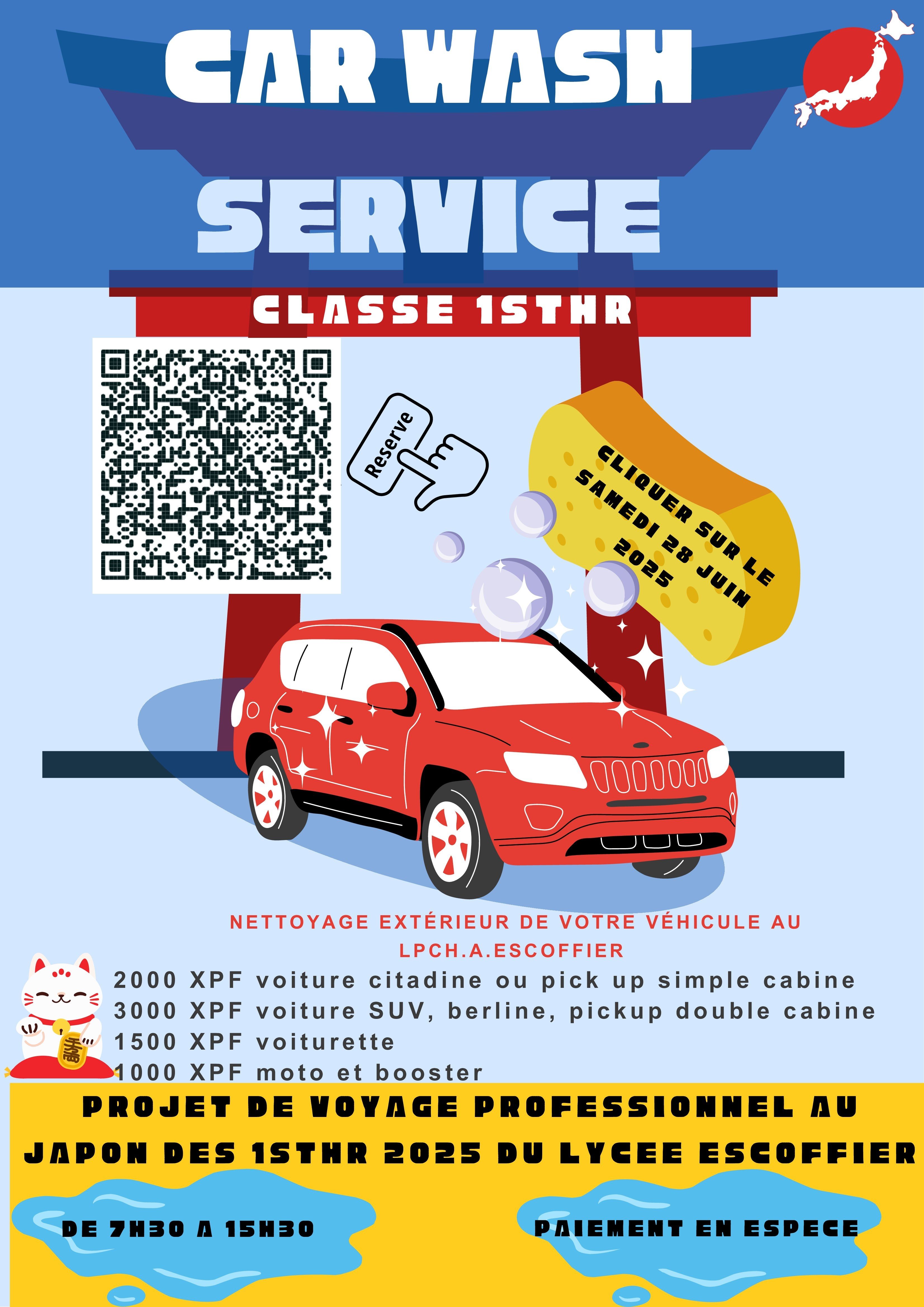 Les élèves de 1ère STHR (Sciences et Technologies de l'Hôtellerie et de la Restauration) du lycée Professionnel Commercial et Hôtelier ont un projet : un voyage professionnel au Japon ! L'objectif de ce séjour est de leur permettre de visiter des établissements hôteliers, saisir les tendances en matières de restauration et de rencontrer des professionnels du secteur, une expérience inestimable pour leur formation. Pour concrétiser ce projet, ils organisent une opération de CARWASH.