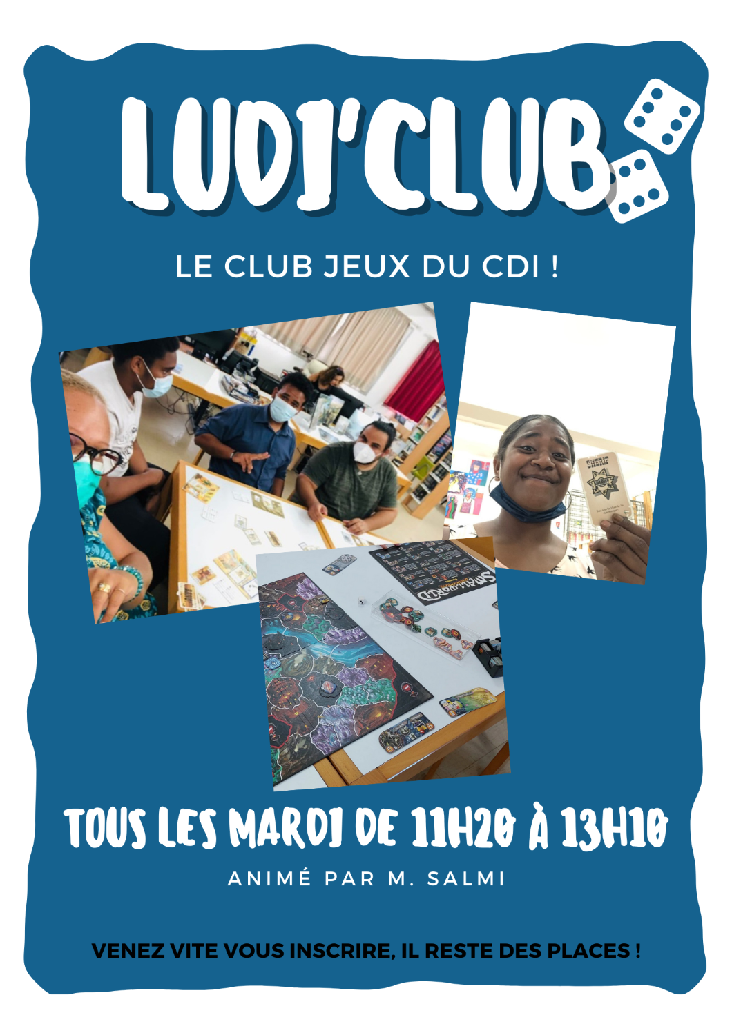 C'est parti, le Ludi'Club est ouvert depuis le mardi 15 mars ! Et il est ouvert à tous ! Venez découvrir tous les mardis à 11h20 au CDI ce club animé par M.Salmi autour de plusieurs jeux de sa collection personnelle (en attendant l'arrivage de la grosse commande !)