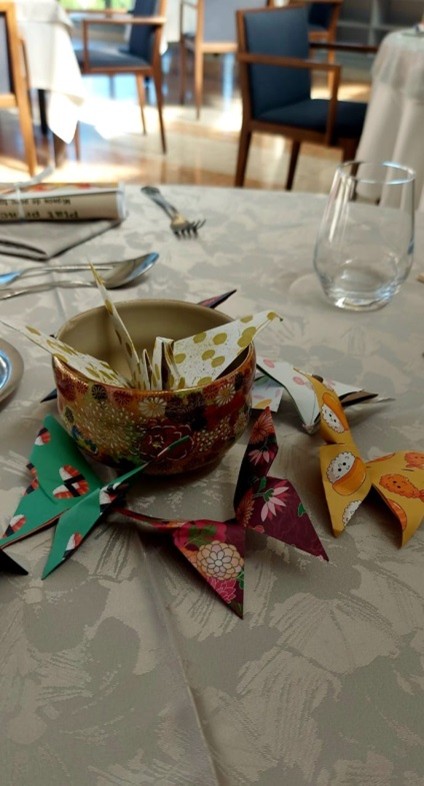 Lors de leur arrivée, les clients étaient pris en charge en japonais, dès la réception du restaurant. Chacun des élèves s’est appliqué à mettre en pratique les enseignements reçus en cours de japonais. Les tenues étaient dans le thème car les élèves au service ont accepté de porter des yukatas et des kimonos. De même, l’ensemble de la salle était décoré avec des objets venant du japon, les tables ornées d’origamis faits par les élèves de 1STHR afin d’offrir aux clients une expérience à part.