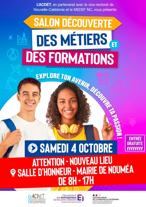 Tu te poses des questions sur ton avenir professionnel ? Tu veux découvrir des métiers, des formations et rencontrer des acteurs du monde de l’éducation et de l’entreprise ? Le Salon Découverte des Métiers et des Formations, organisé par l’ACDET en partenariat avec le vice-rectorat de Nouvelle-Calédonie et le MEDEF NC, est fait pour toi !